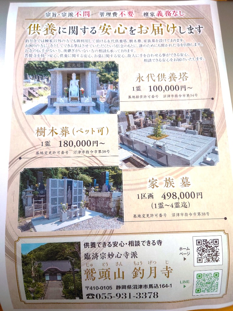 令和6年度沼津市の「おくやみハンドブック」(役所に死亡届を提出すると渡される冊子)に、釣月寺の永代供養・樹木葬・家族墓の広告を載せました火葬だけした方、納骨場所を探している方、故人の供養を考えている方等、お困りの方に対し釣月寺としてお手伝いができればと思っています。