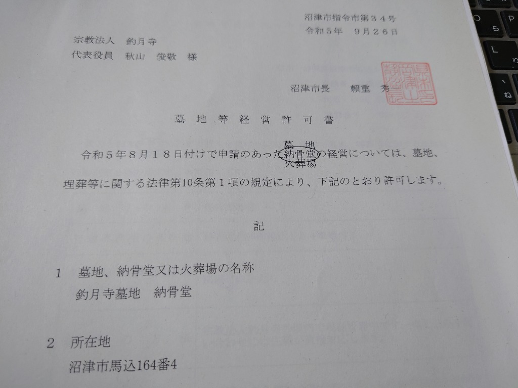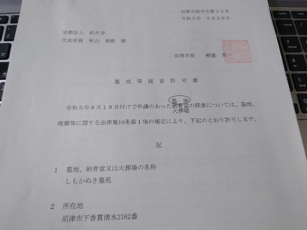 9月26日付で「しもかぬき墓苑」(沼津市指令市第33号)と、永代供養塔(沼津市指令市第34号)の墓地経営許可をいただきました。